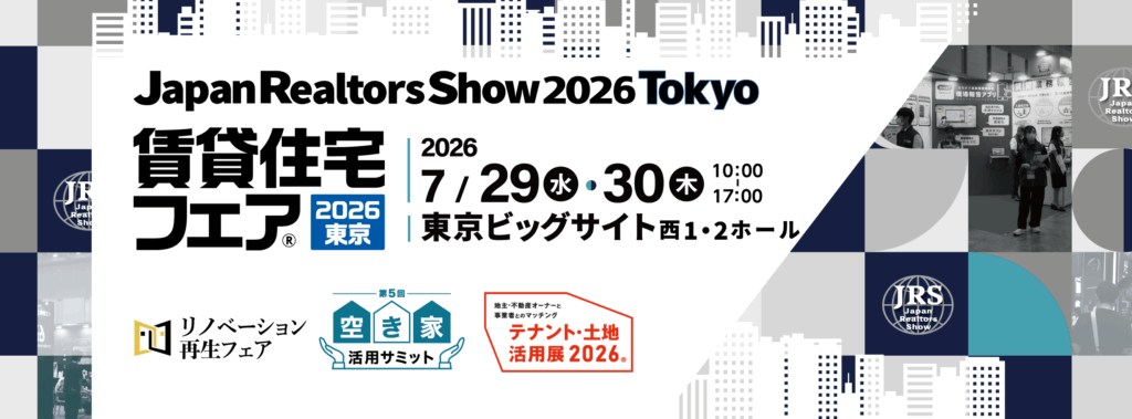 ジャパン・リアルターズ・ショーは、毎年、夏の東京(東京ビッグサイト)と、秋の大阪(インテックス大阪)で開催します。30年続く「賃貸住宅フェア」を中心に、不動産会社や不動産の所有者、不動産業界向けソリューションを提供する事業者が集まります。